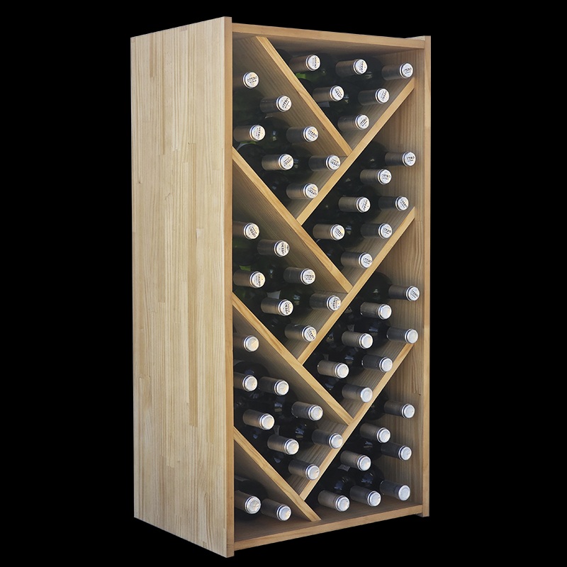 This modular wooden wine rack with cross dividers and compartments combines aesthetics and functionality. Made from light oak-colored pine wood, it is ideal for storing up to 48 bottles.